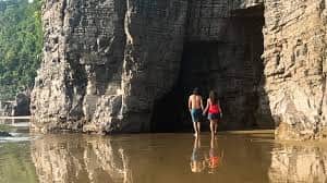 Cascada El Pavón is the kind of waterfall you stumble upon and immediately wonder why it isn’t world-famous — a jungle-hidden cascade crowned by a massive boulder perfectly wedged between the rocks.